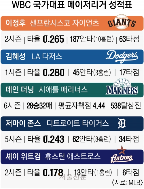 류지현 감독이 이끄는 WBC 대표팀에는 5명의 MLB 선수가 합류한다. 이정후(28·샌프란시스코 자이언츠)와 김혜성(27·로스앤젤레스 다저스) 그리고 어머니가 한국인인 한국계 선수 데인 더닝(32·시애틀 매리너스), 저마이 존스(29·디트로이트 타이거스), 셰이 위트컴(28·휴스턴 애스트로스)이 주인공이다.