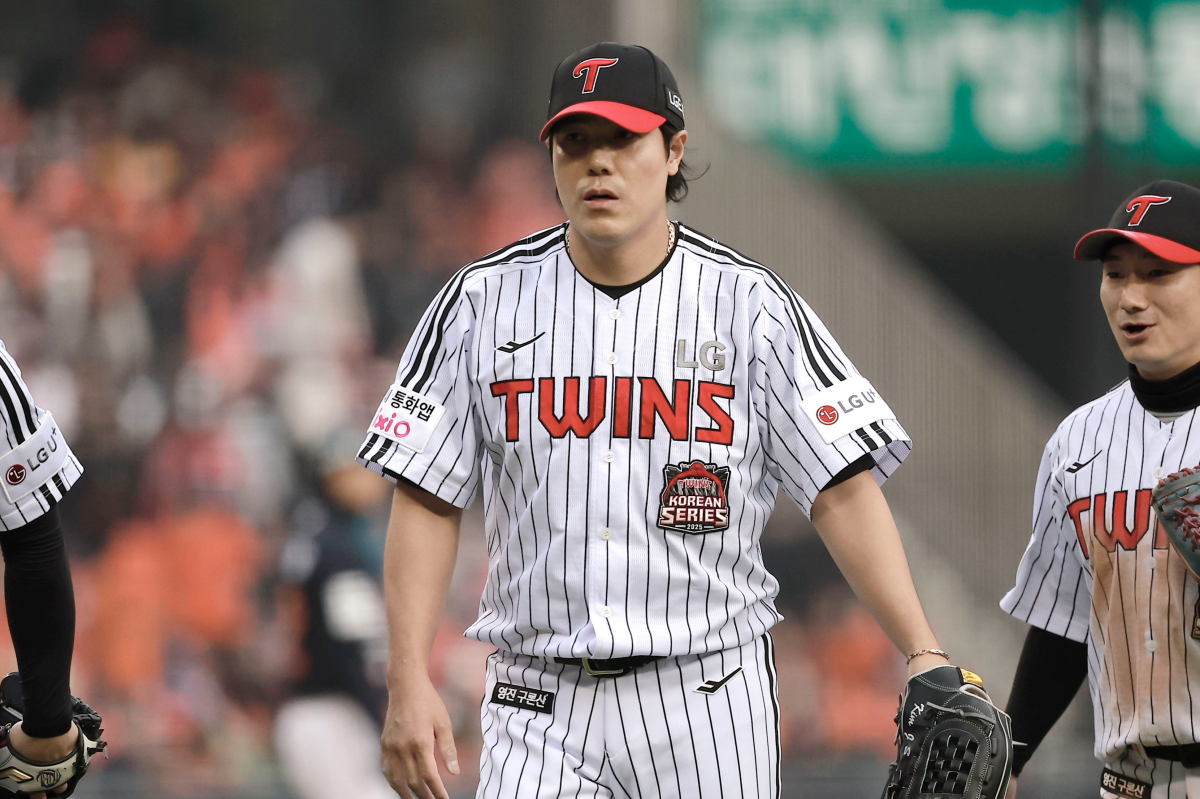 프로야구 LG 트윈스 김진성이 오른팔을 휙휙 돌리며 마운드에 올랐다. 팀이 7-5로 쫓기던 한국시리즈(KS·7전4승제) 2차전 4회 2사 만루 위기였지만 김진성은 표정 변화 없이 포크볼에 이은 높은 직구로 한화 이글스 4번 타자 노시환을 삼진 처리했다. 기세를 높인 LG는 2연승을 달렸고 김진성은 KS 최고령 승리 투수(40세 7개월 20일)가 됐다.